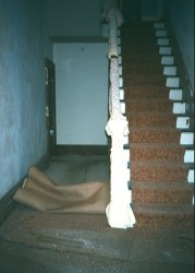 The lower hallway before restoration, with the mahogany bannister protected from damage during work